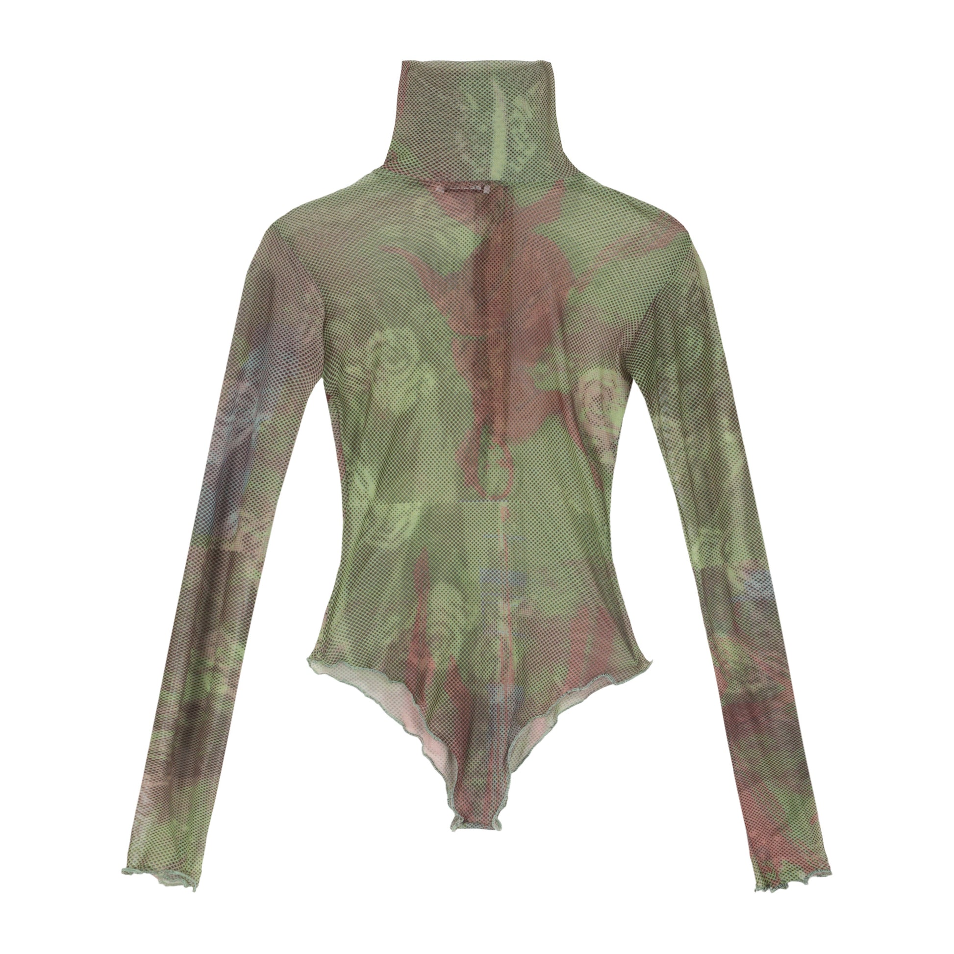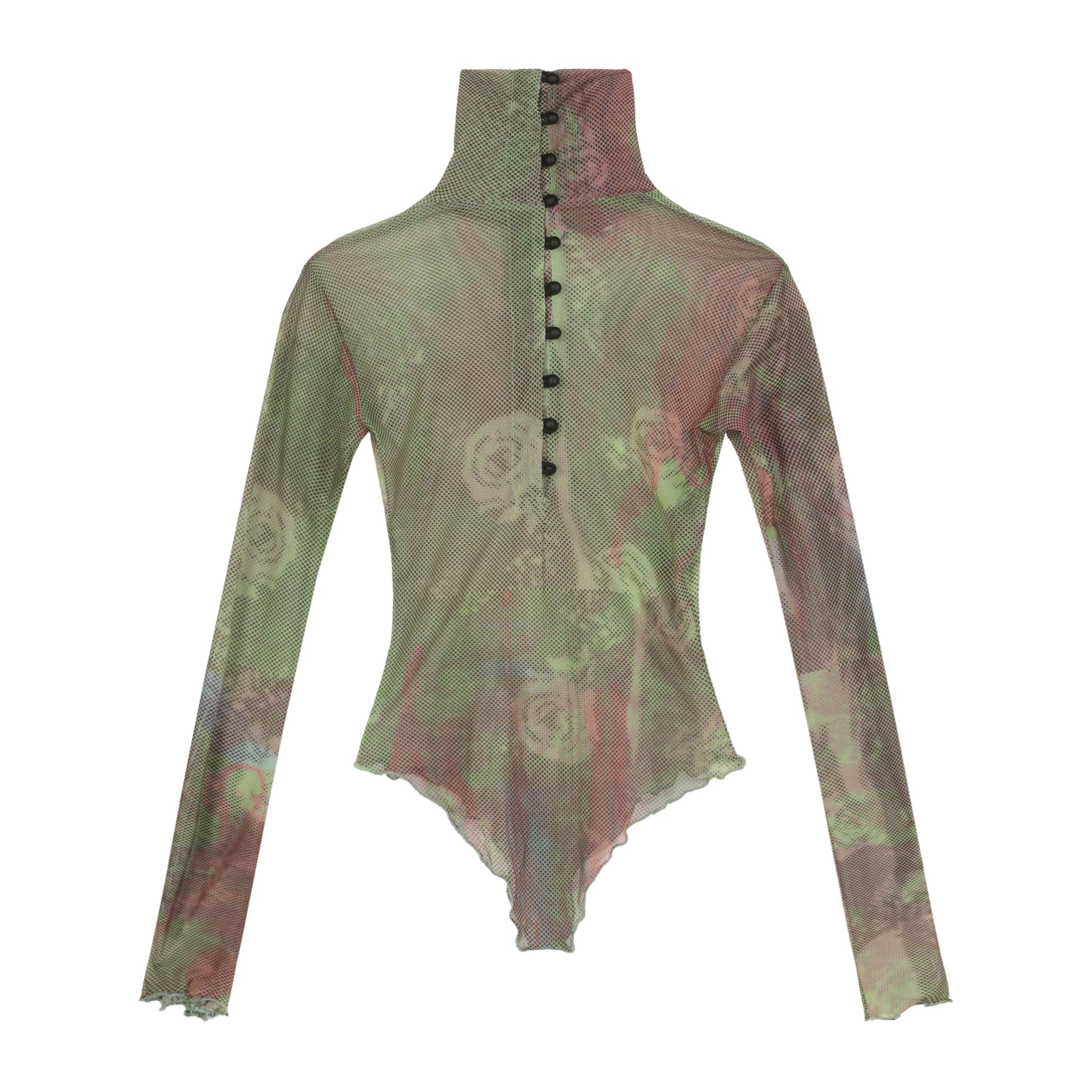The Aiko body is a second skin that blends sensuality and character. Made from mesh with recycled fibers, it hugs the body with a form-fitting silhouette, ensuring comfort and freedom of movement. The print, hand-drawn by Mattia Pozzo, makes each piece unique, turning it into a wearable work of art.