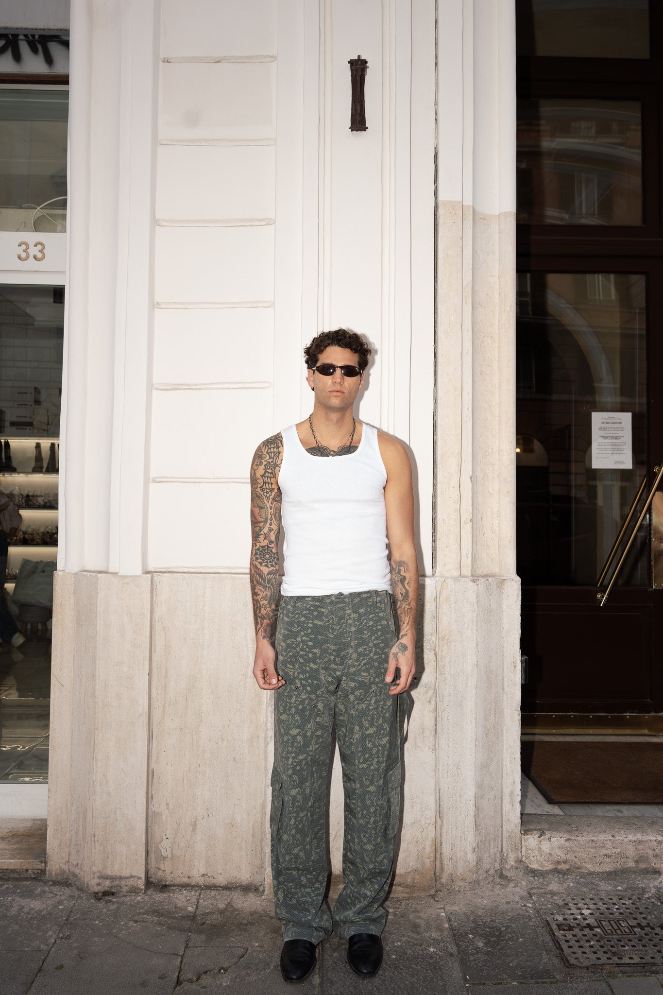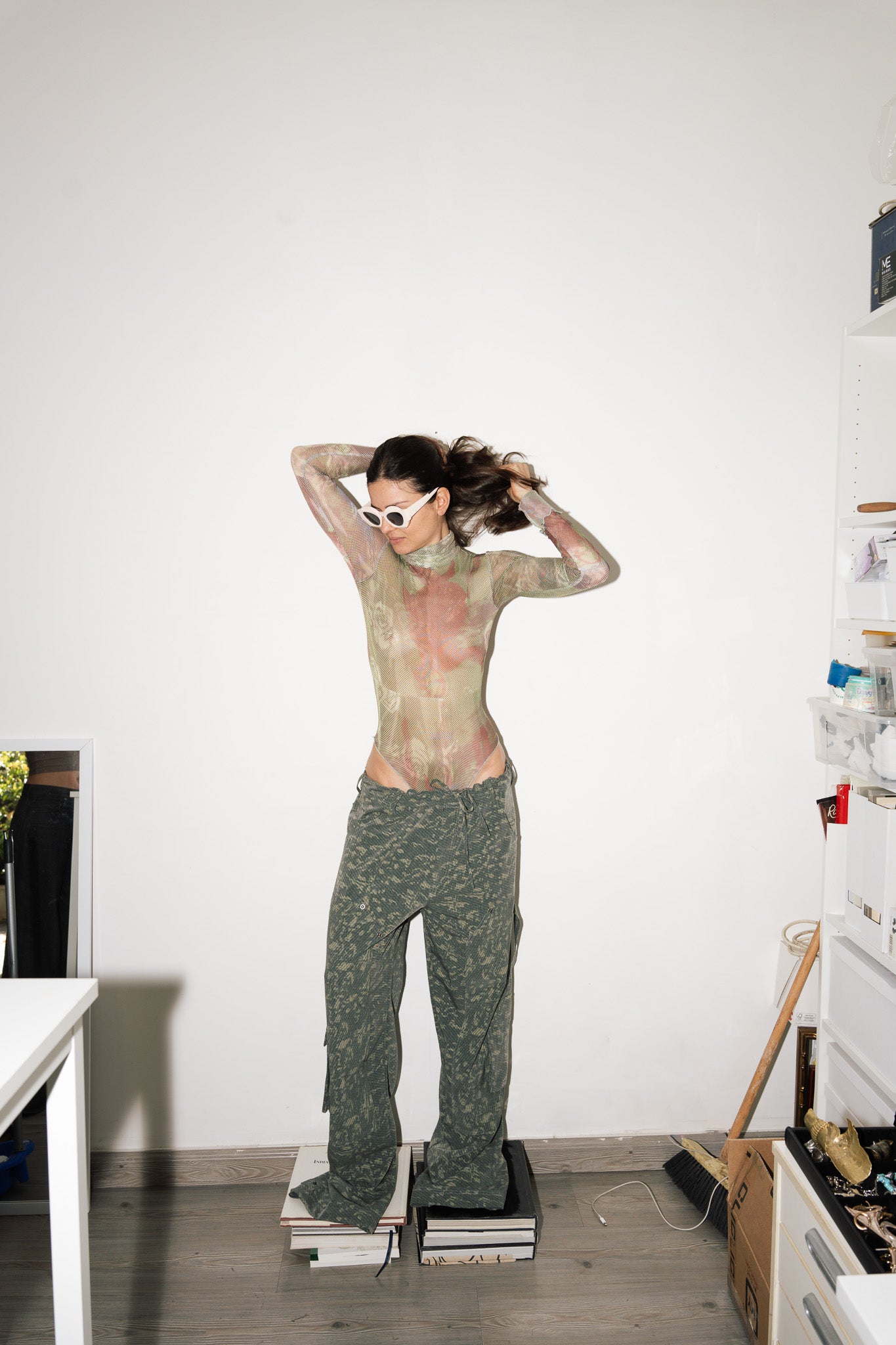 Where bold design meets functionality. The Kumiko pants combine versatility and statement aesthetics, crafted from recycled fiber-based fabric as part of our commitment to sustainable fashion—without compromising on style. Featuring a washed-out effect that mimics denim, they achieve a distinctive, lived-in look that enhances their character. The original print, hand-drawn by Mattia Pozzo, transforms each piece into a wearable work of art, reinforcing the unique identity of the collection.