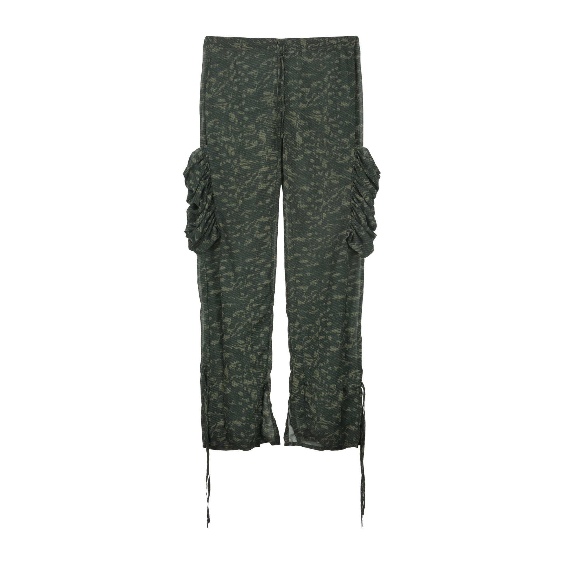 Effortless elegance with a contemporary edge. The Midori pants are designed to move with the body, featuring a soft, flowing fit that enhances movement and drapes beautifully. Made from 100% recycled PA, the fabric offers a delicate transparency that subtly reveals the silhouette, adding a sensual yet refined touch. The adjustable waist tieensures a customizable fit, allowing the pants to adapt perfectly to the body. The intricately draped pockets, handcrafted with precision, add a sculptural element, blending functionality with an artistic touch.